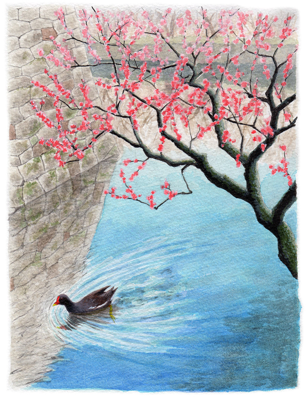 Eurasian moorhen and Japanese Apricot—the magazine Wild Bird (July/August, 2023) by Wild Bird Society of Japan (Acrylic, 2023).