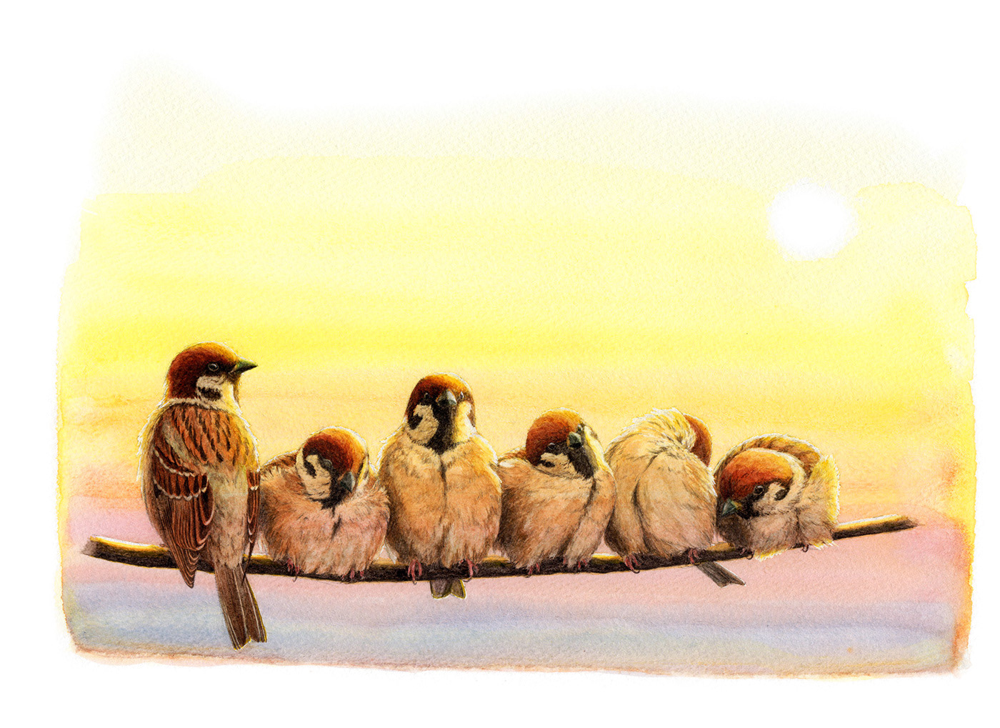 Eurasian Tree Sparrow—the 2019 New Year's card by Wild Bird Society of Japan (Watercolor, 2018).